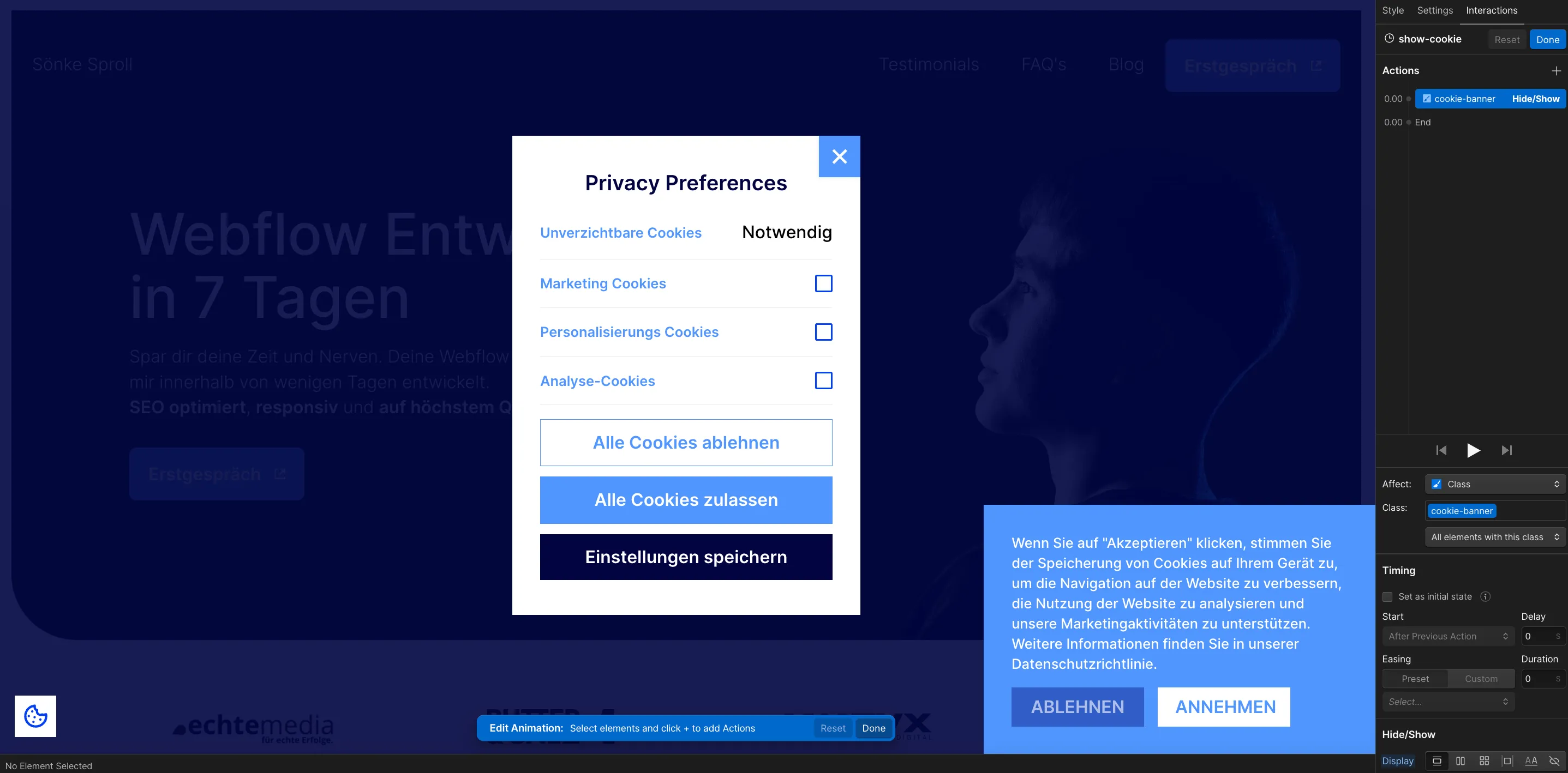 Hinweis: Durch diese Einstellung ist der Preview-Modus in Webflow nicht mehr richtig nutzbar. Das bedeutet, du musst deine Tests direkt auf der Live-Seite durchführen. Falls du den Preview-Modus doch nutzen möchtest, kannst du die Interaktion "cookie-show" auf der jeweiligen Seite einfach vorübergehend löschen.